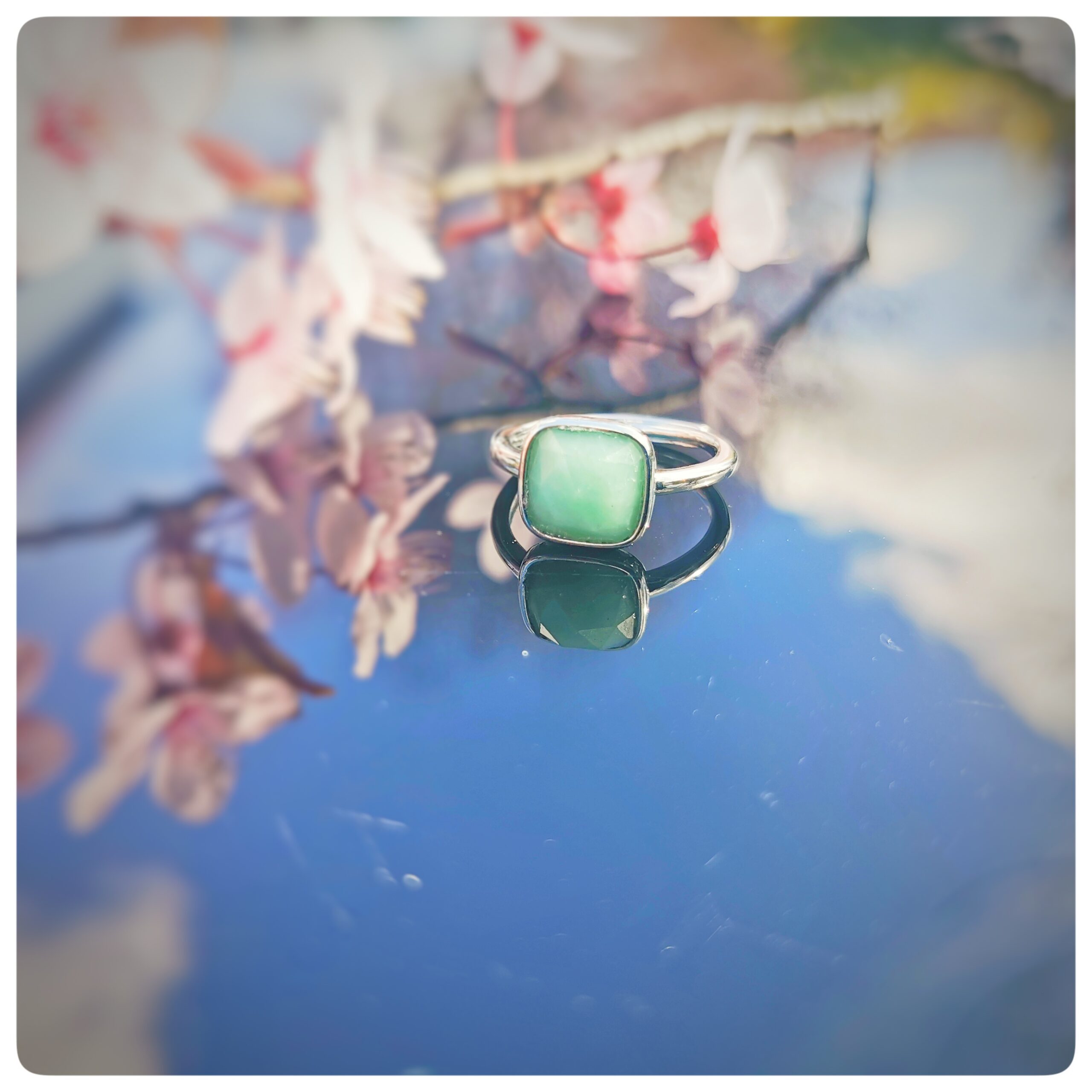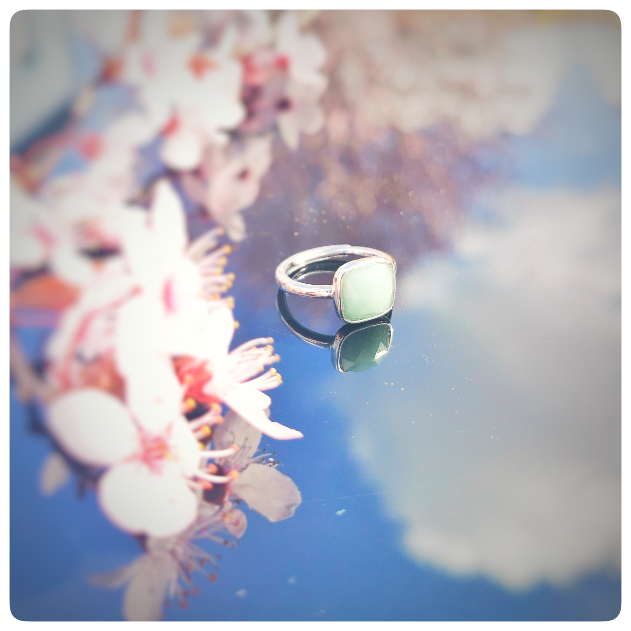 Une bague argentée à la forme carrée, surmontée d’un cabochon facetté de 9 mm en aventurine.