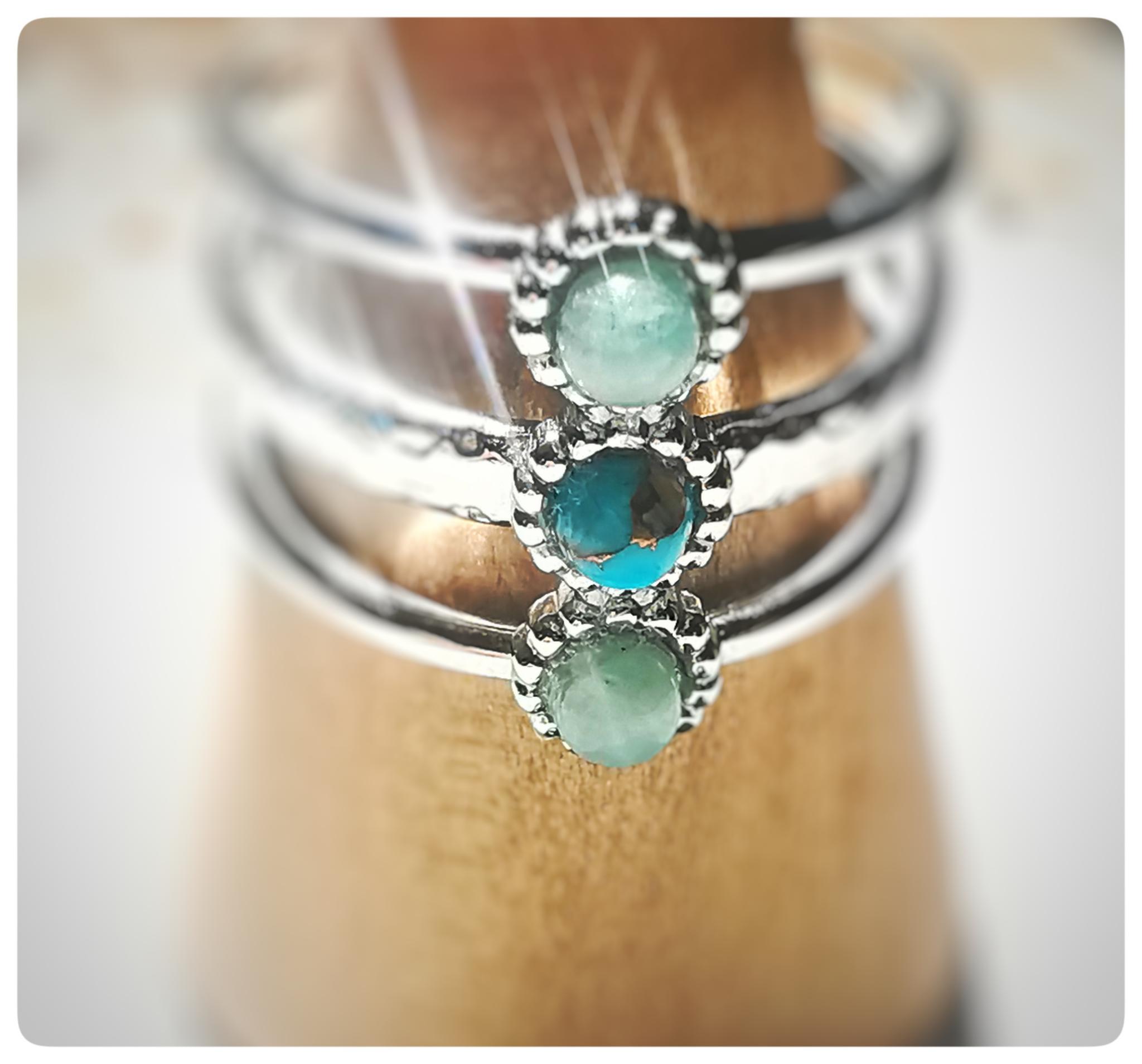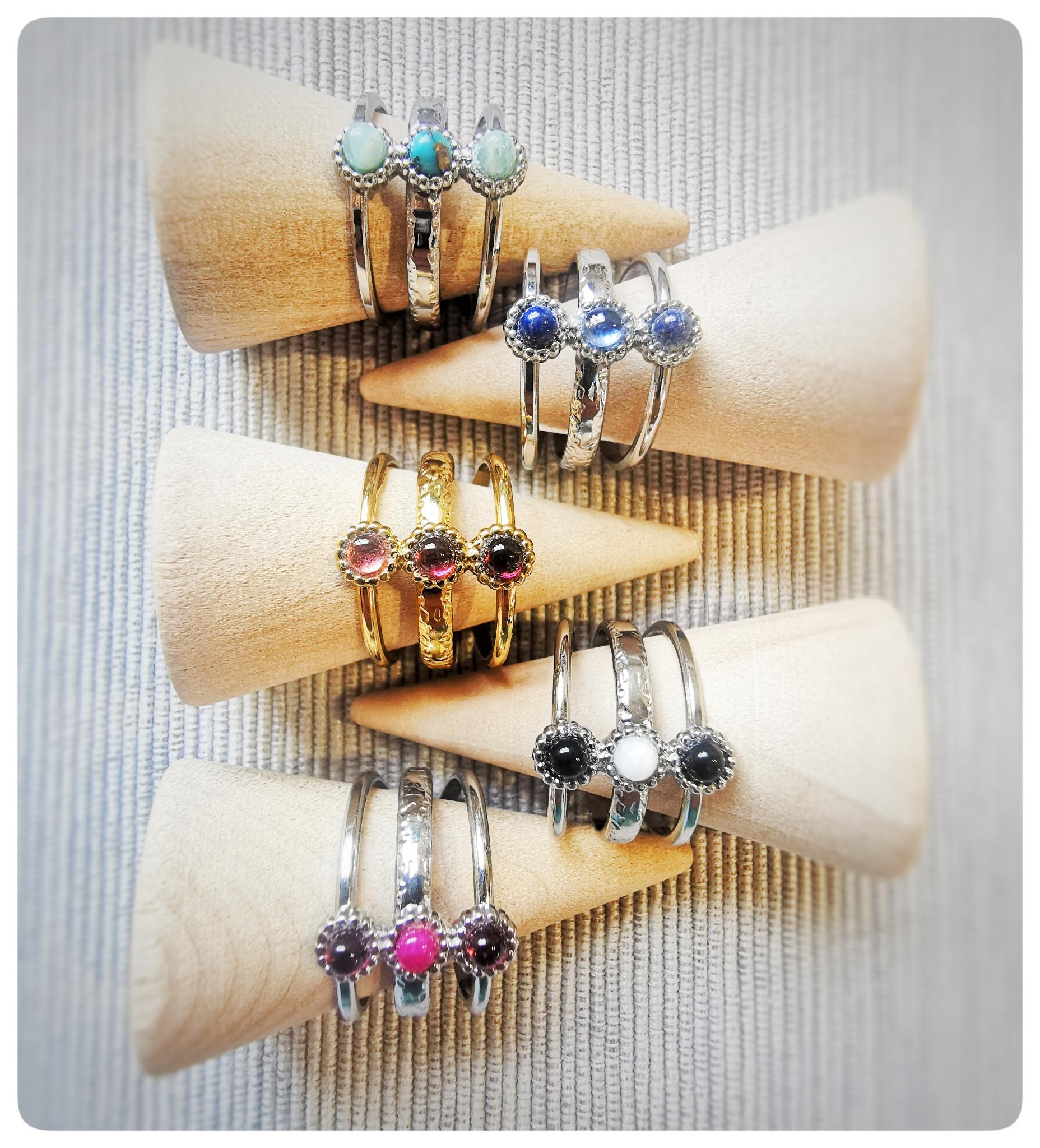 Sur le dessus, trois petites pierres naturelles viennent signer l’ensemble. Un trio minéral, lumineux, personnalisable, qui donne à la bague juste ce qu’il faut de présence.